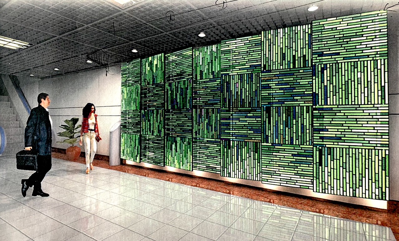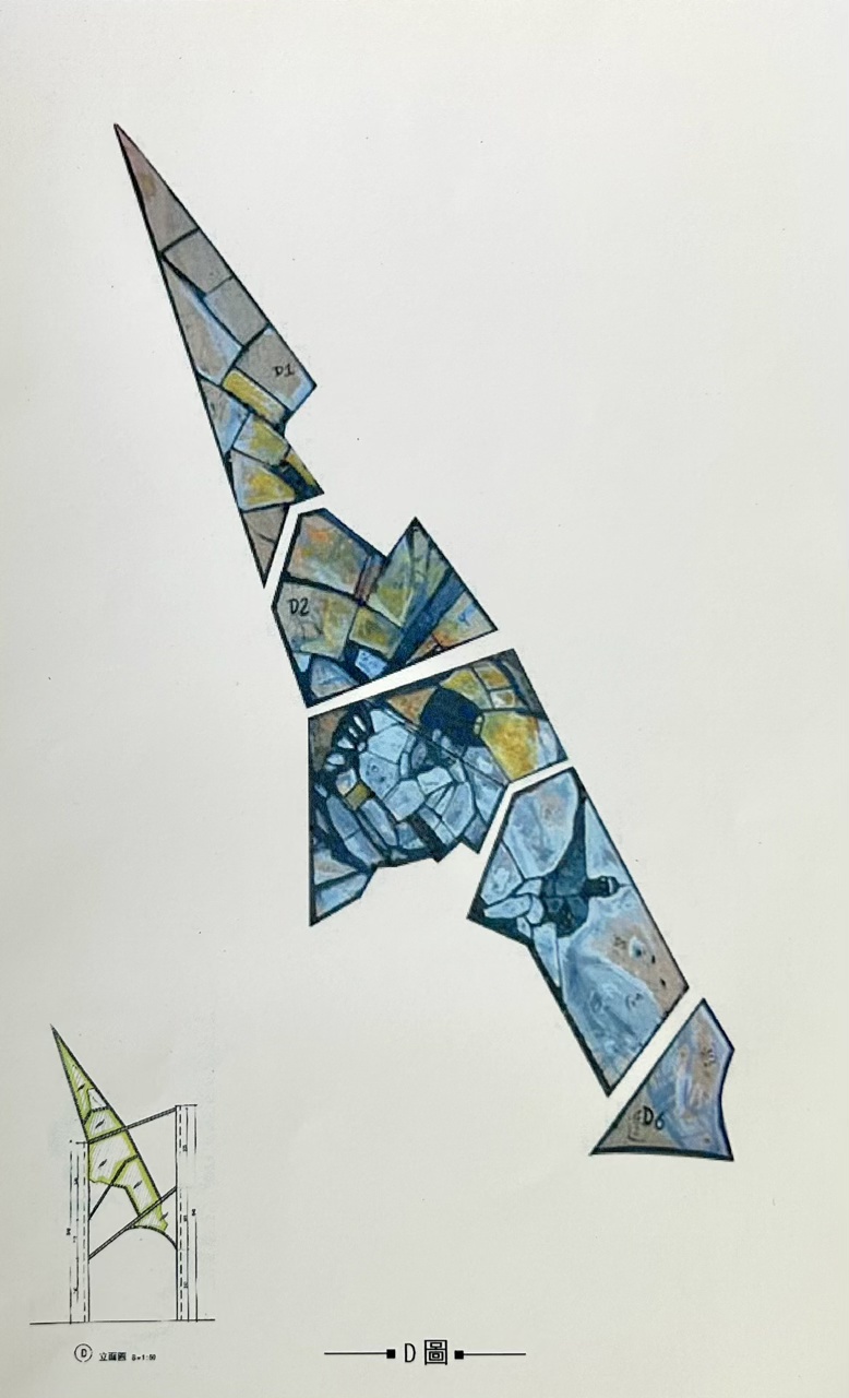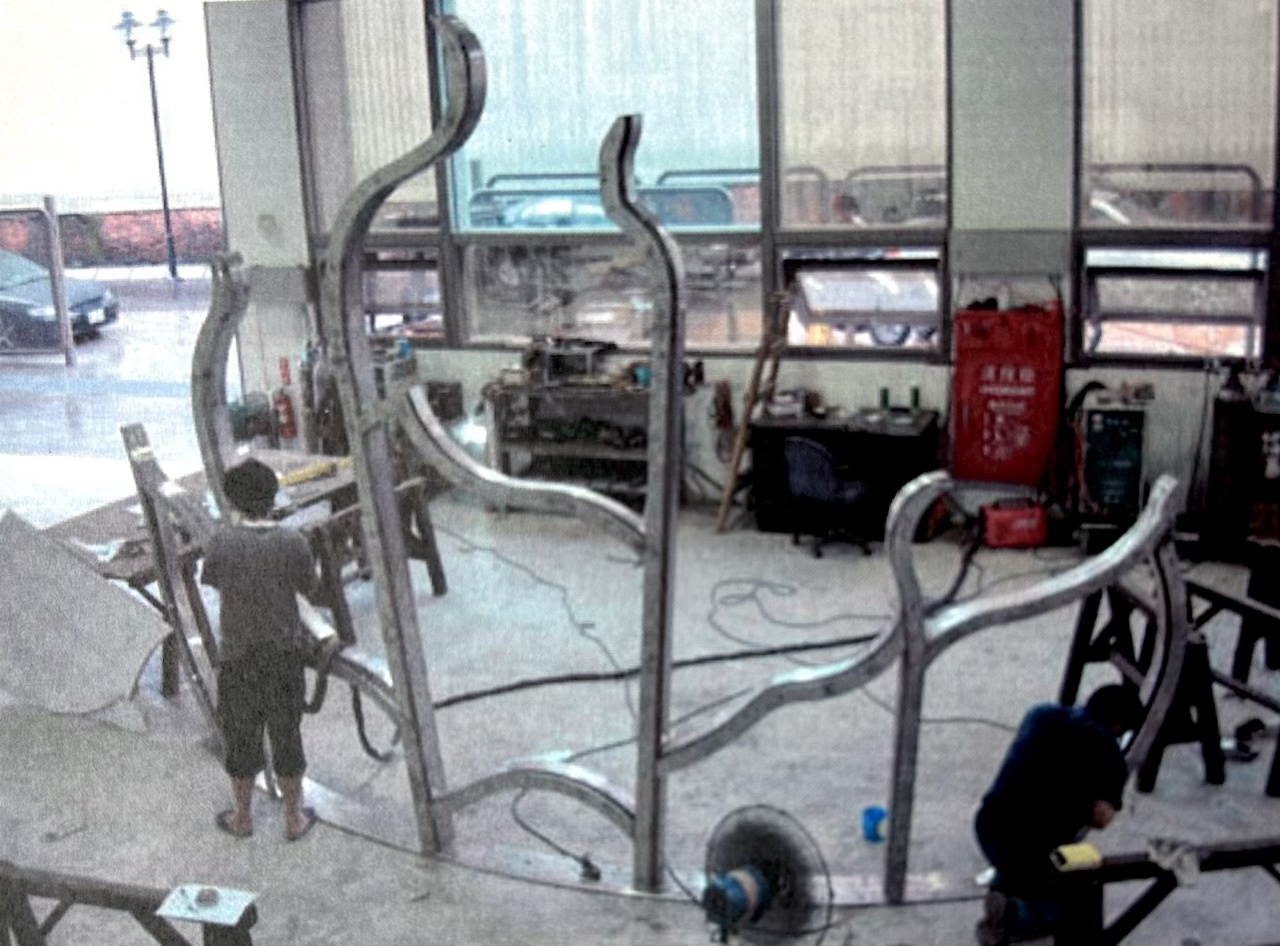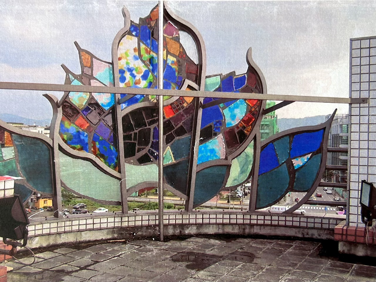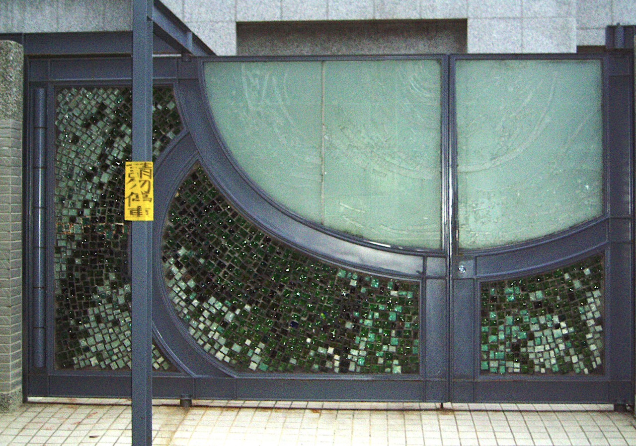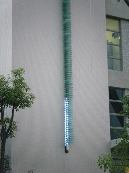 而在整體性與藝術性兼顧的考慮下,本作品嘗試將整面玻璃帷幕 視為紙材,在其上揮灑中國書法文字之美,利用噴砂鐫刻文字線 條,營造一種類似碑文的美感。