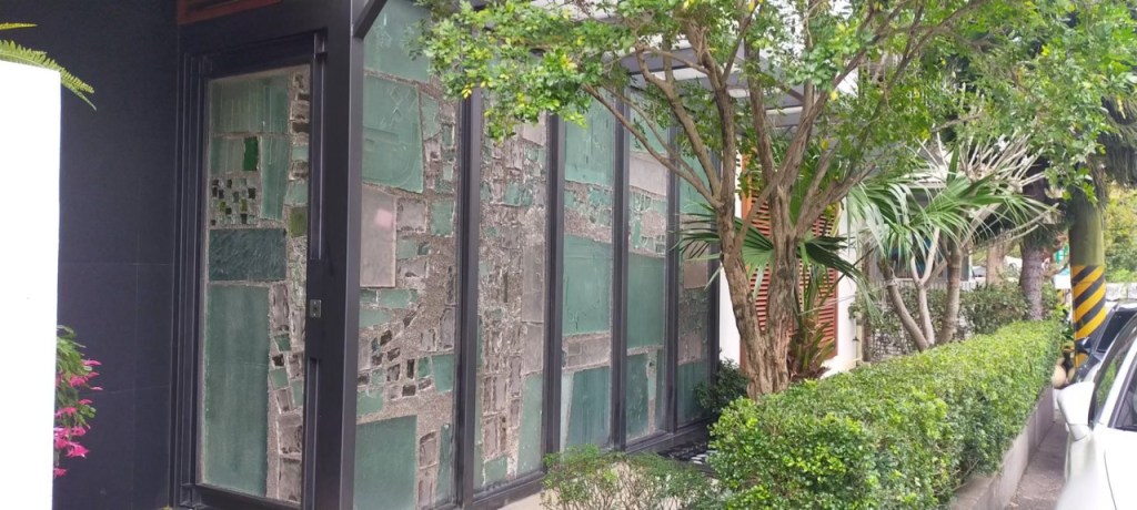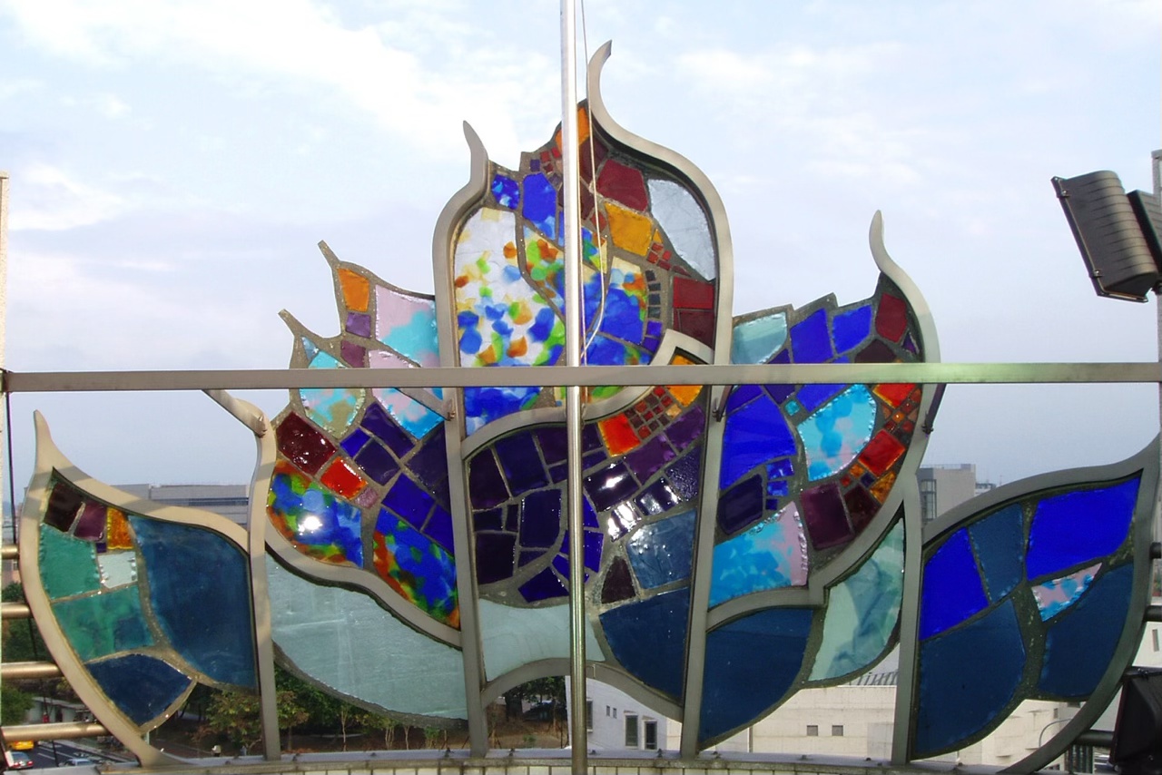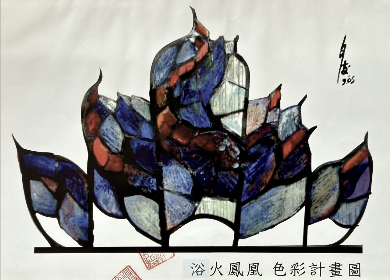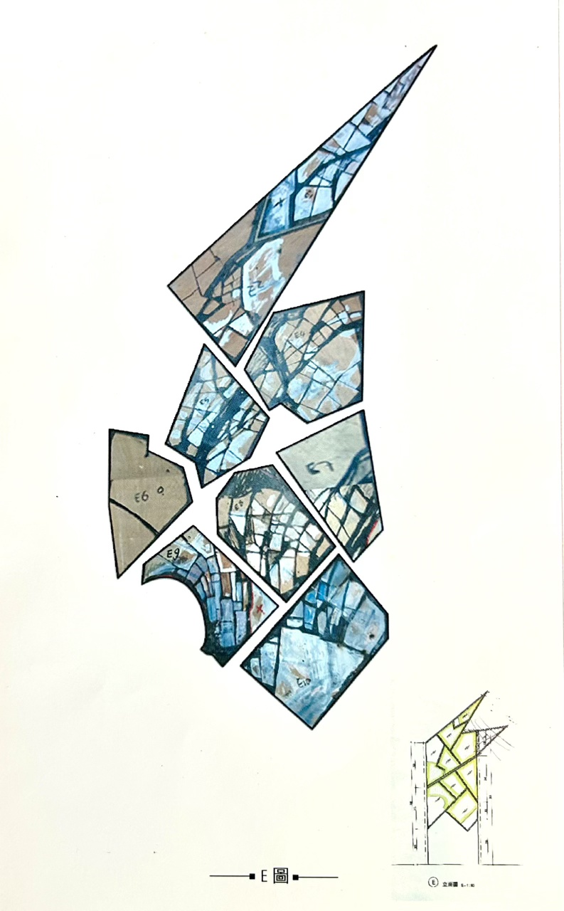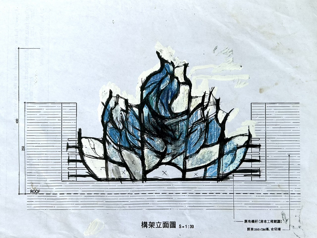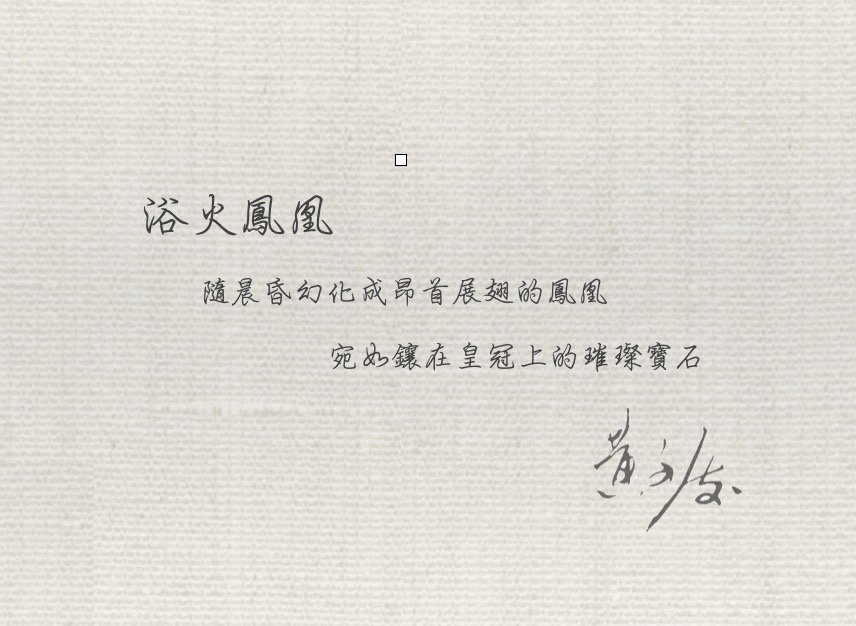 而在整體性與藝術性兼顧的考慮下,本作品嘗試將整面玻璃帷幕 視為紙材,在其上揮灑中國書法文字之美,利用噴砂鐫刻文字線 條,營造一種類似碑文的美感。