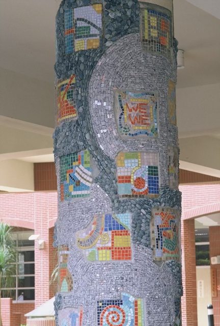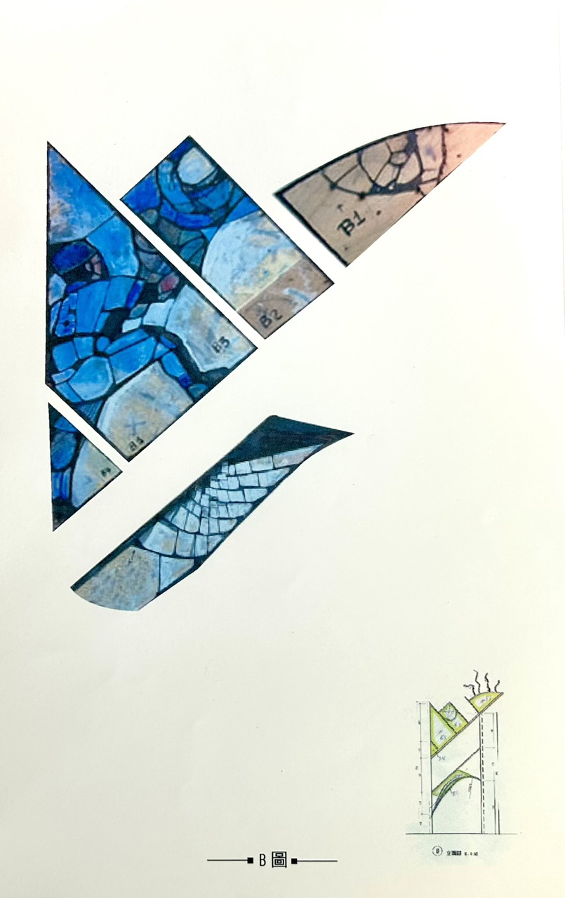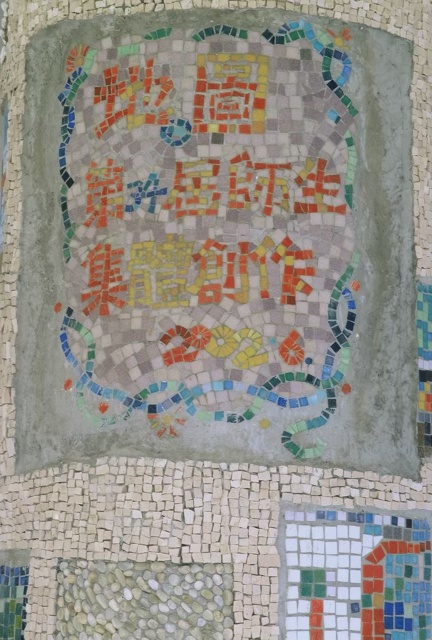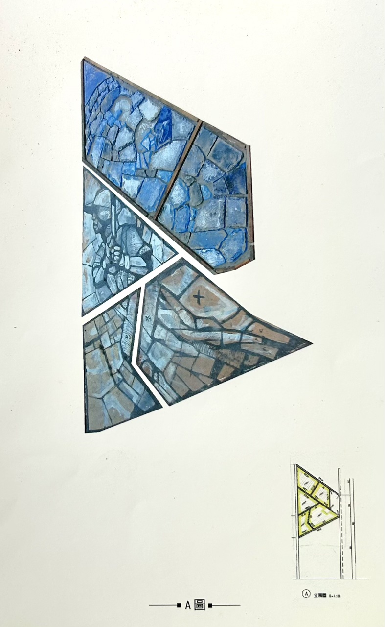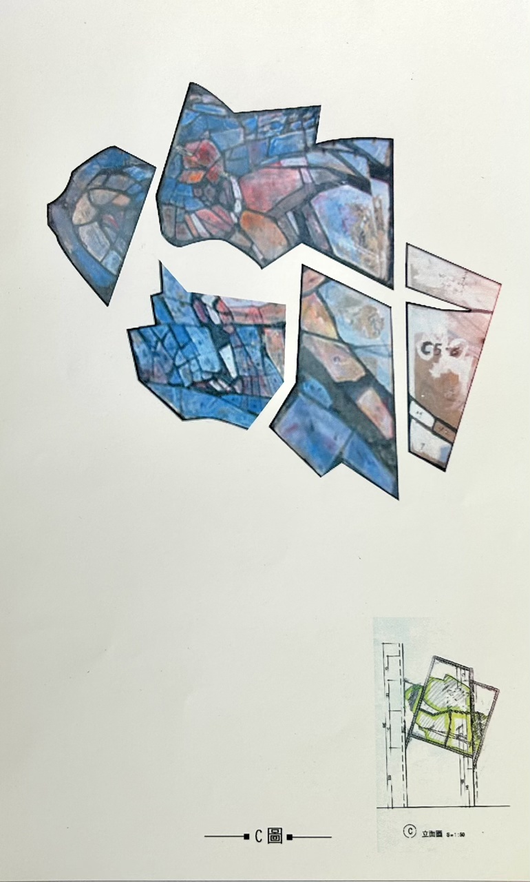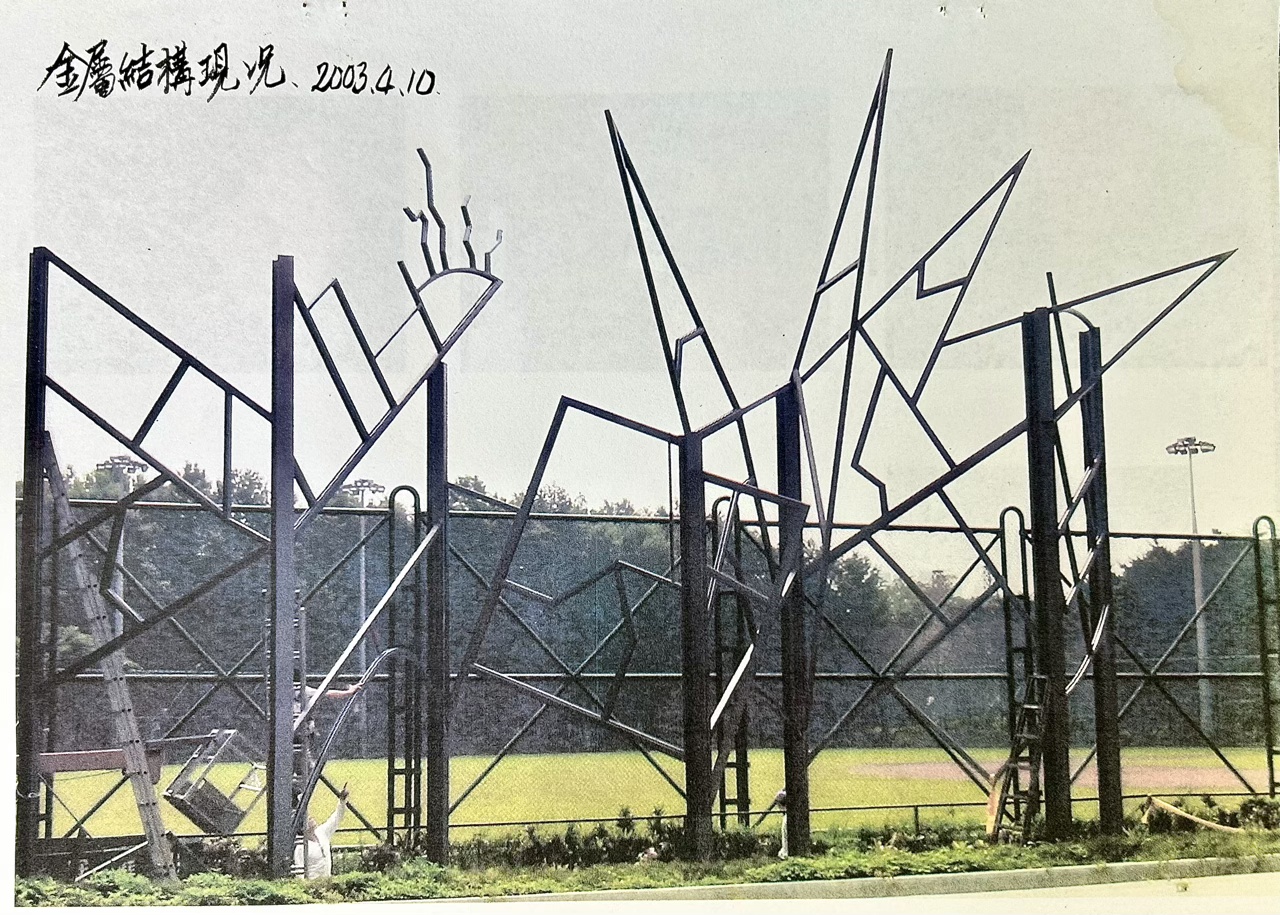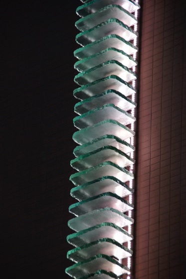而在整體性與藝術性兼顧的考慮下,本作品嘗試將整面玻璃帷幕 視為紙材,在其上揮灑中國書法文字之美,利用噴砂鐫刻文字線 條,營造一種類似碑文的美感。