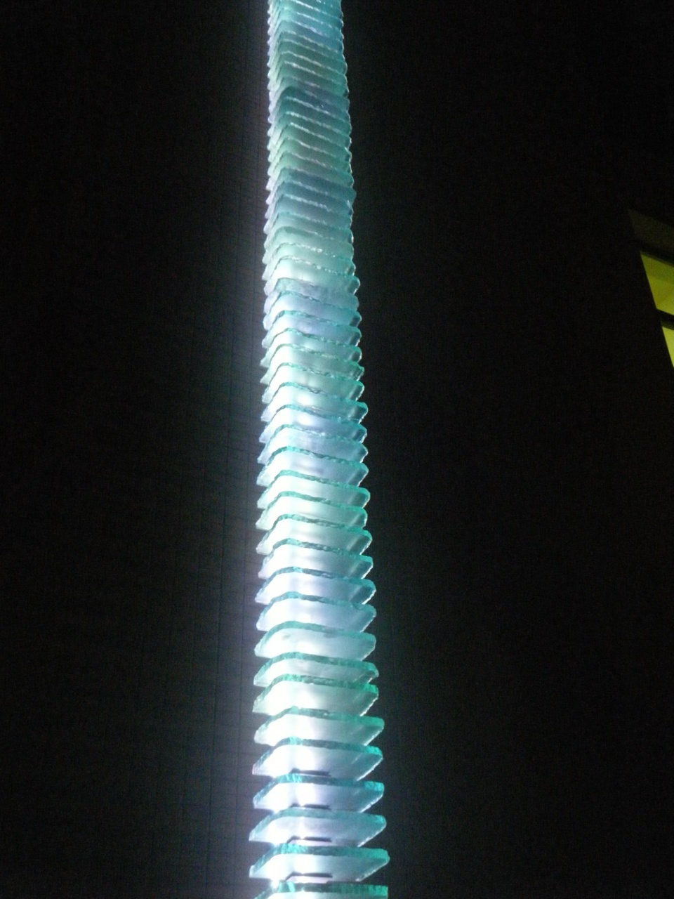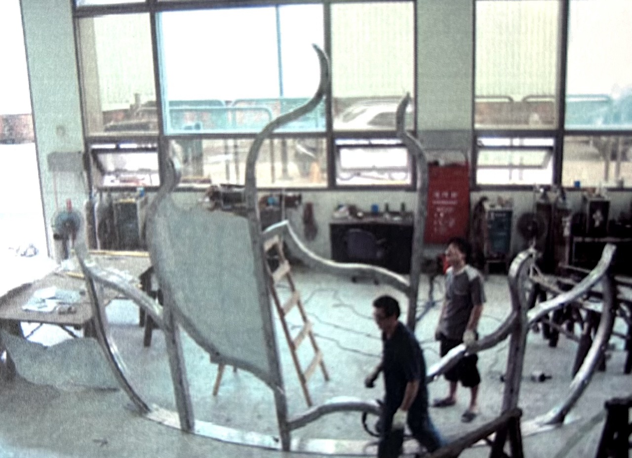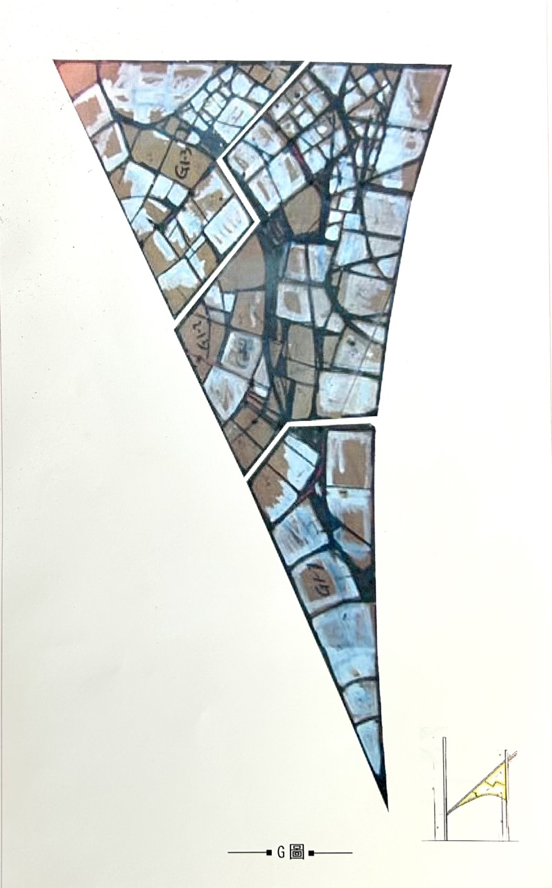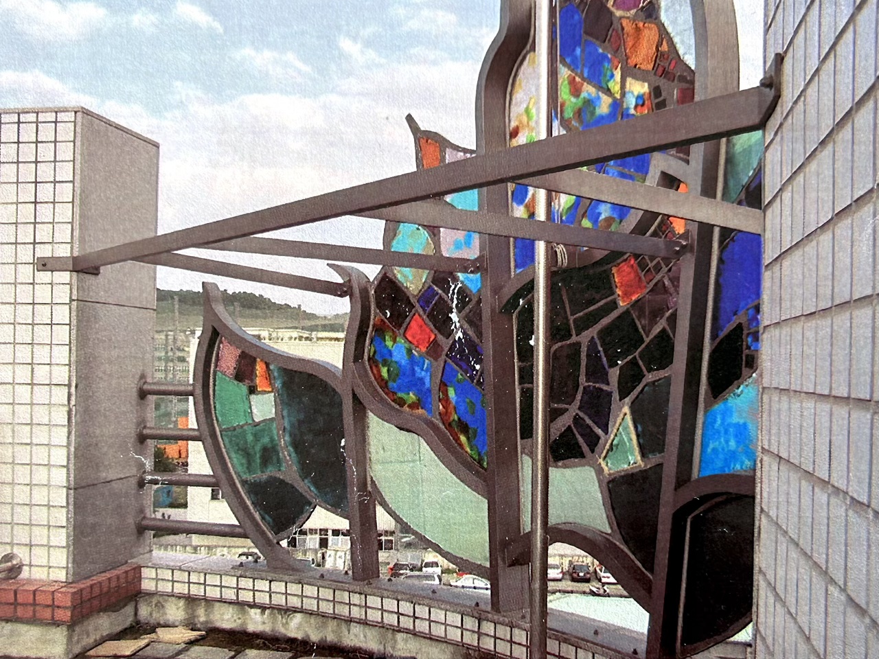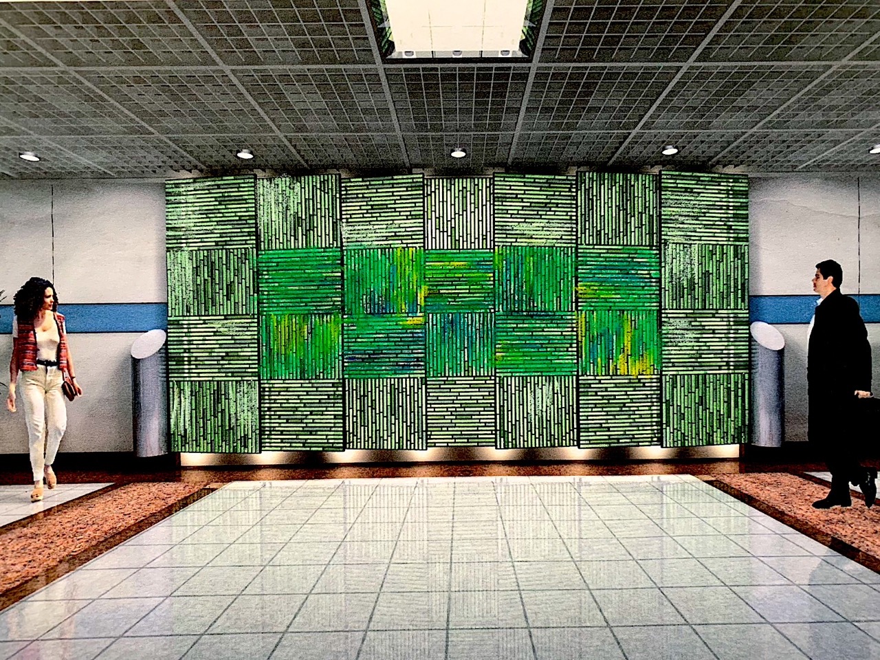 而在整體性與藝術性兼顧的考慮下,本作品嘗試將整面玻璃帷幕 視為紙材,在其上揮灑中國書法文字之美,利用噴砂鐫刻文字線 條,營造一種類似碑文的美感。
