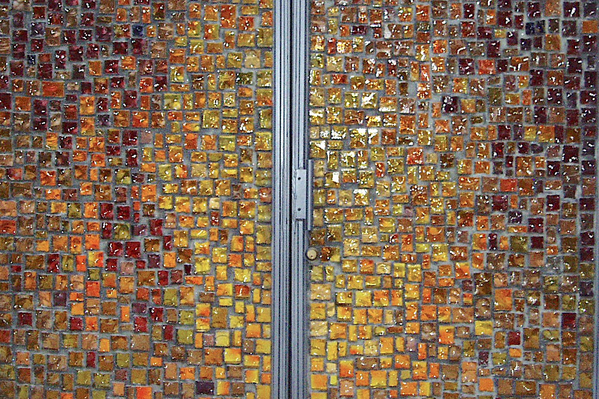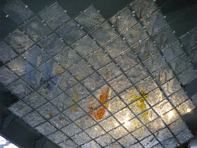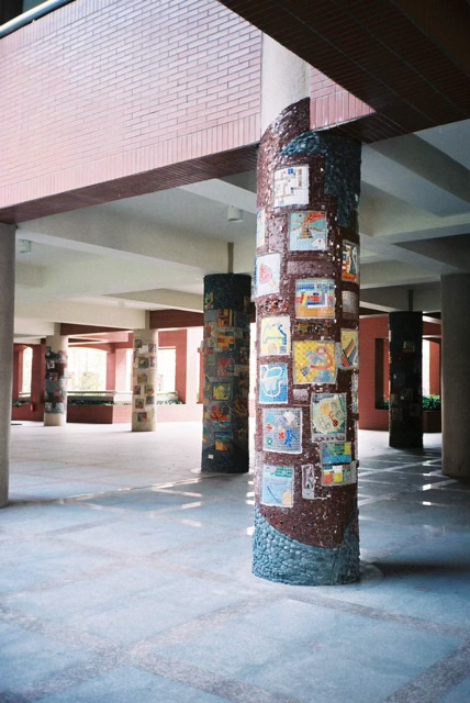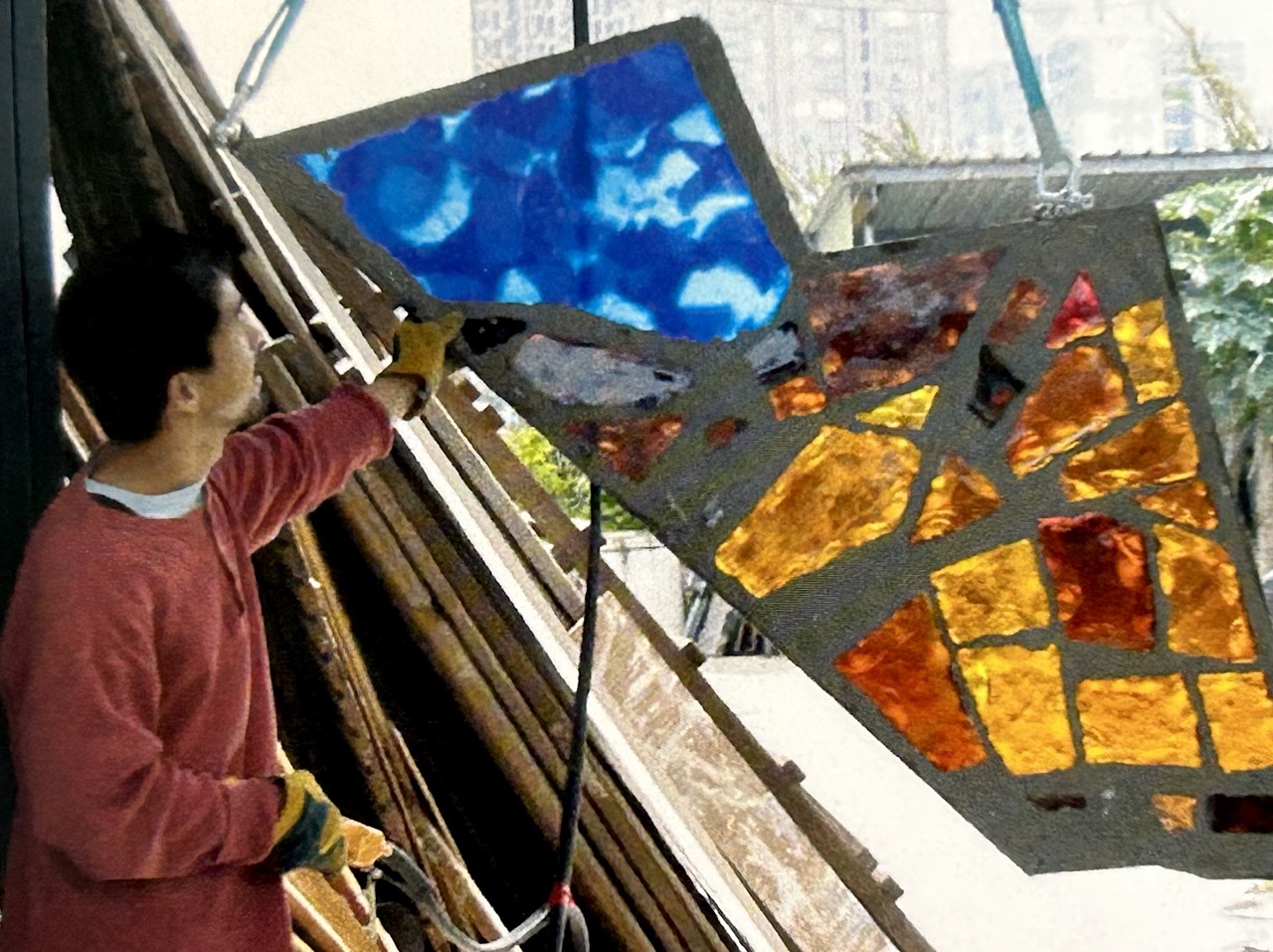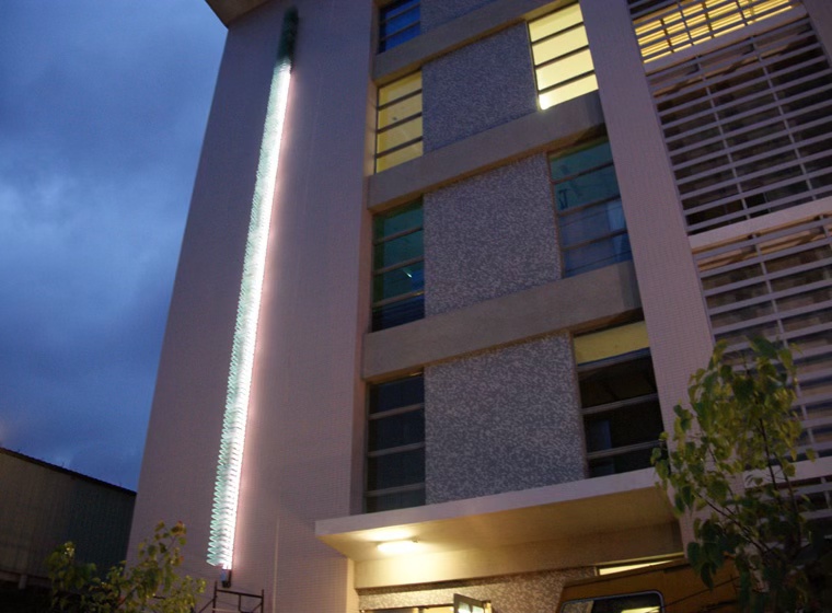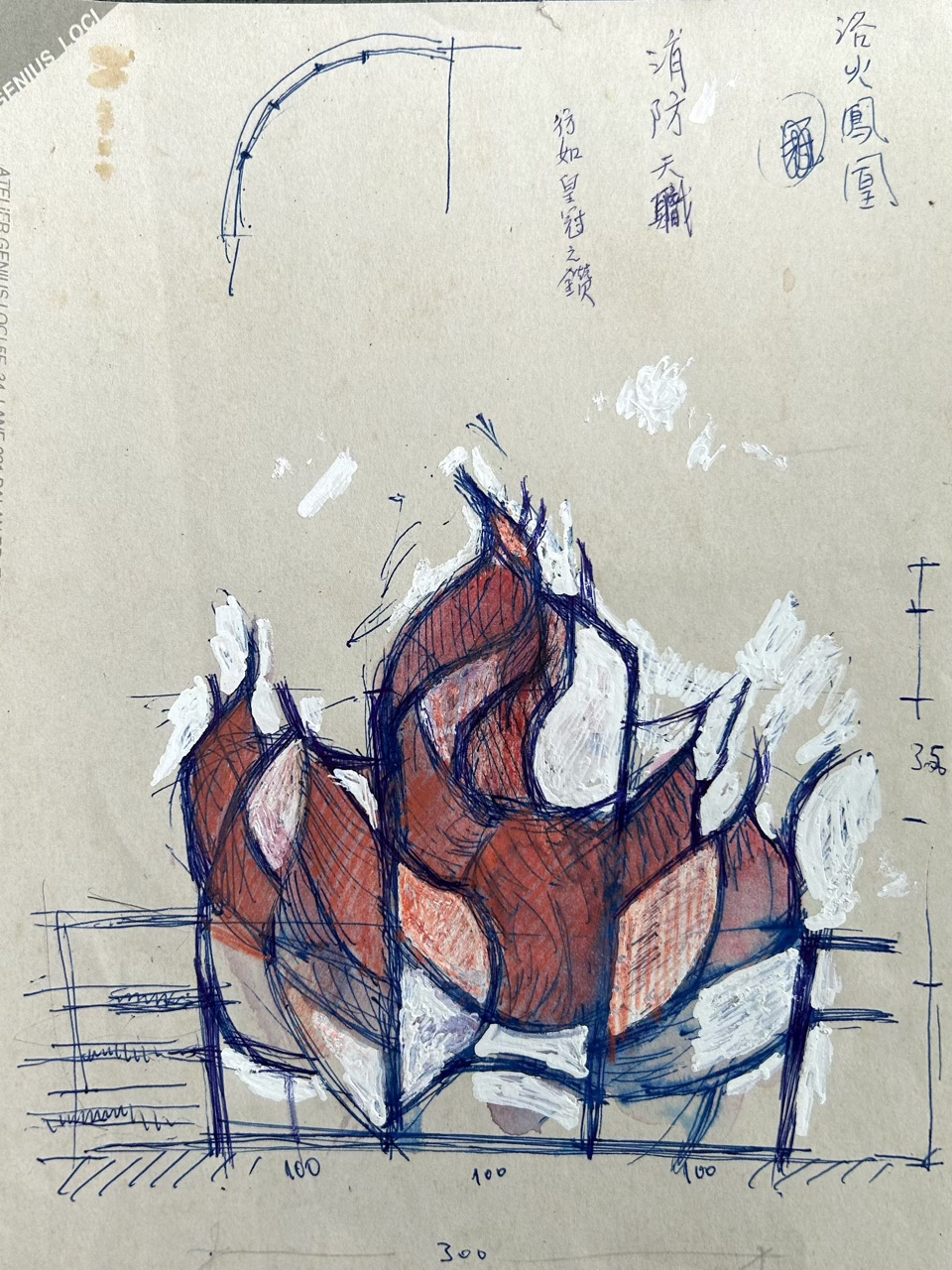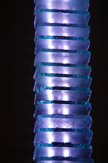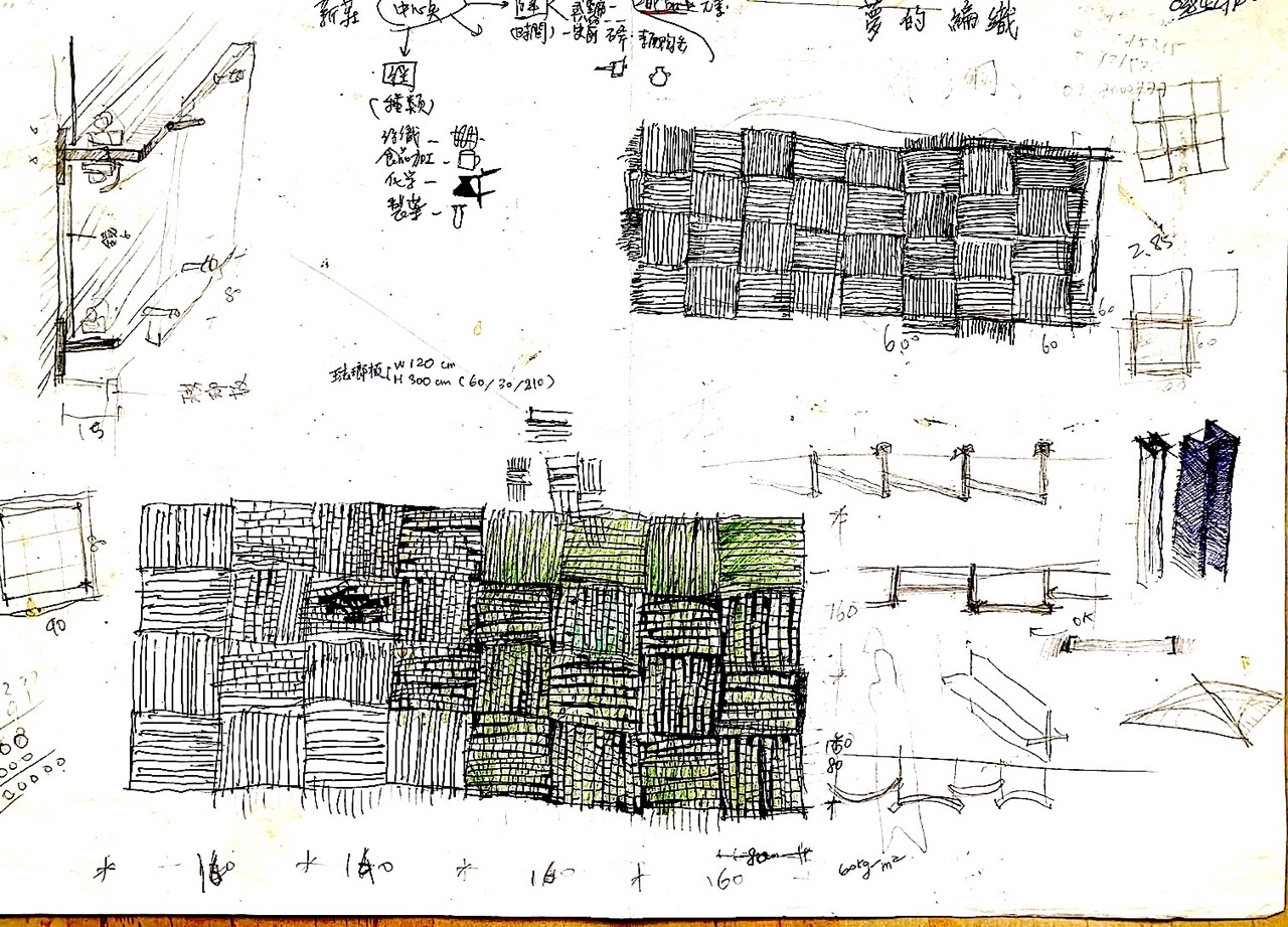 而在整體性與藝術性兼顧的考慮下,本作品嘗試將整面玻璃帷幕 視為紙材,在其上揮灑中國書法文字之美,利用噴砂鐫刻文字線 條,營造一種類似碑文的美感。