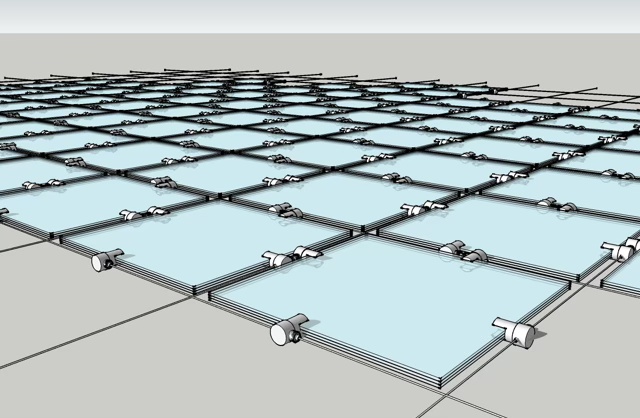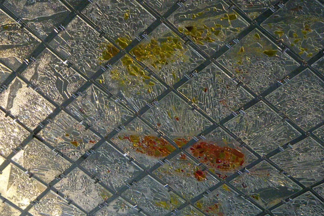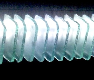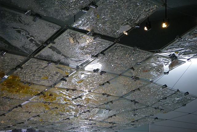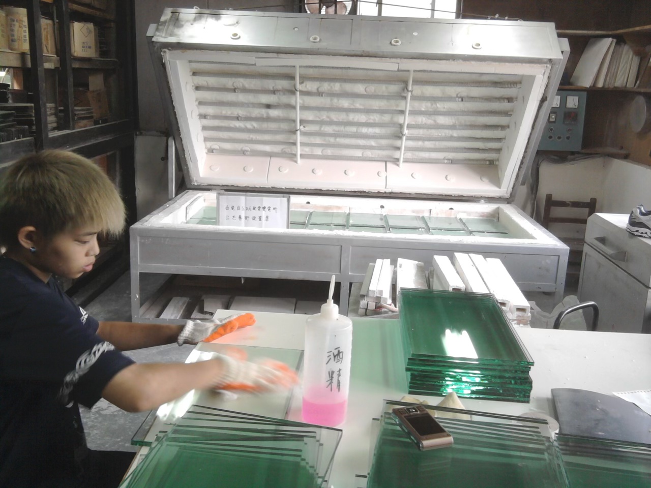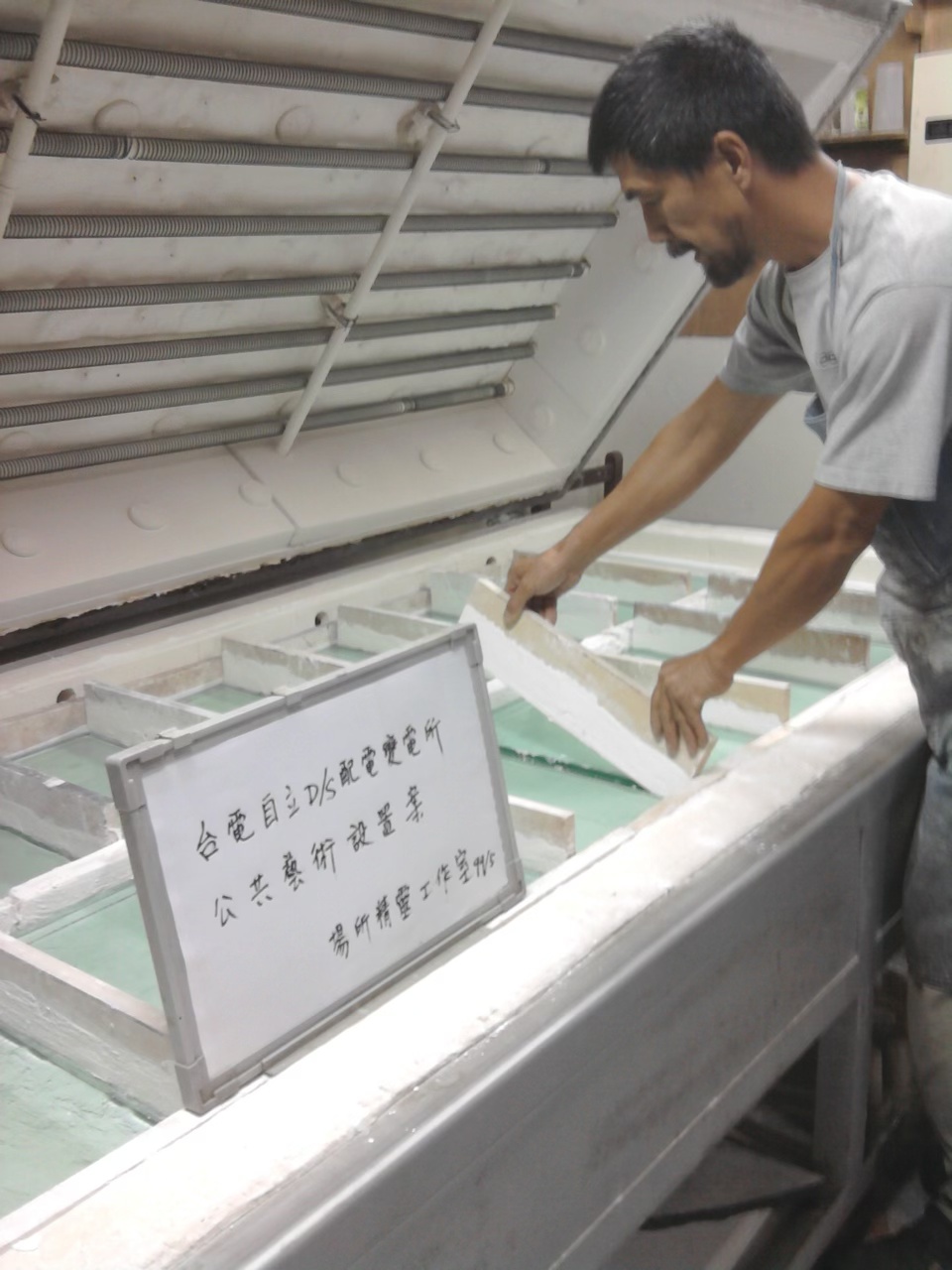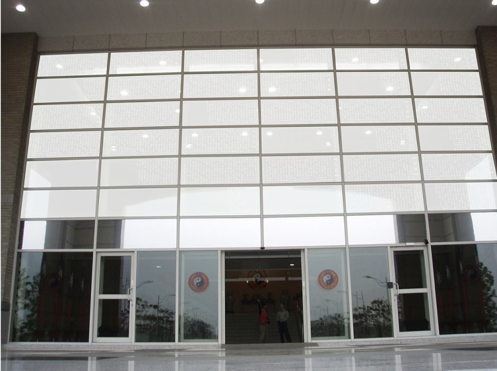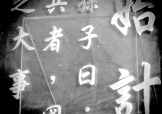 我們利用“電控液晶薄膜”膠合在二層玻璃之間,使文字噴砂玻 璃產生霧化效果,在電源關閉的狀態下,噴砂玻璃上孫子兵法的 文字由於霧化效果而變成不透明,看起來隱隱約約、若有似無。